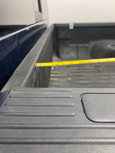 Take your tape measure and place one end on the inside edge of the truck bed behind the cab (this can be done standing in or outside of the truck bed). Measure to the inside edge of the truck bed at the tailgate end at the top of the bed.